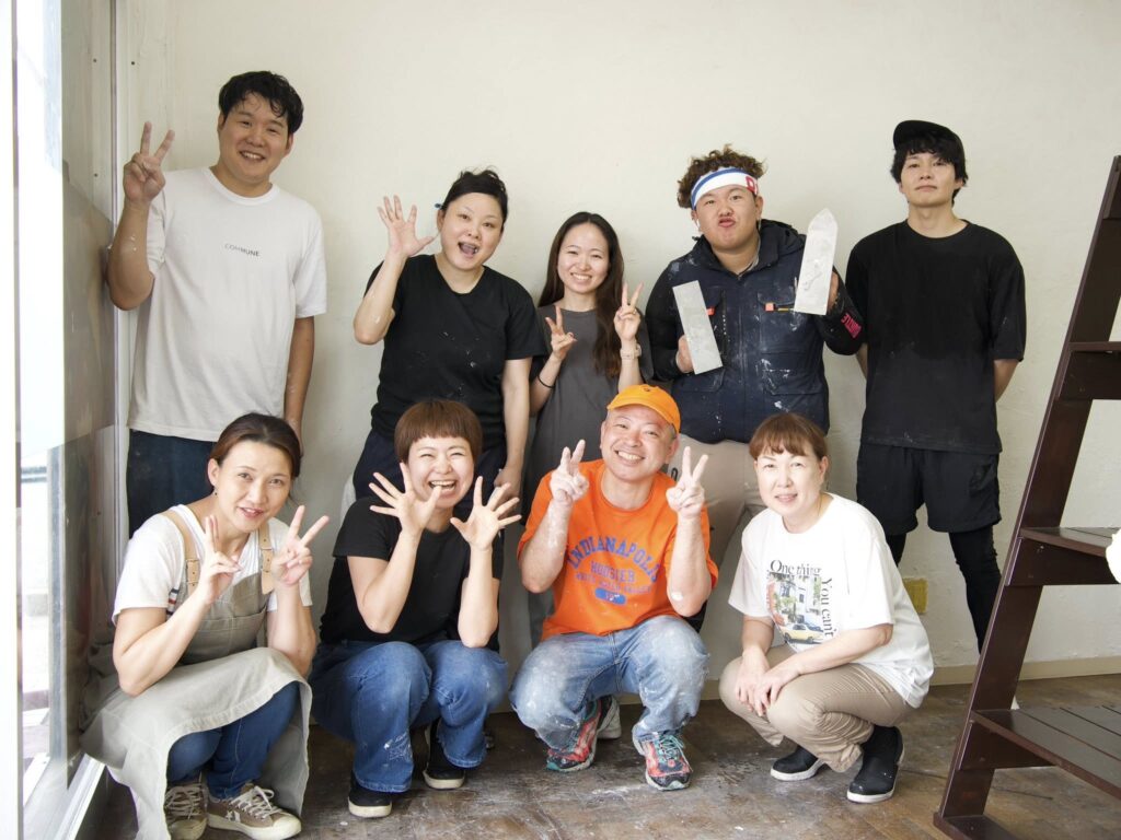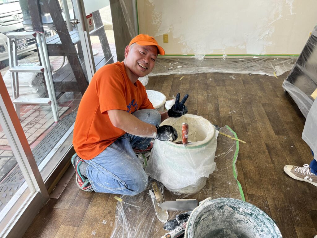 当日はリターンを選び応援された方や親族が集い、店舗のクロスの上から漆喰を塗り、綺麗に明るい内装へと再生しました。