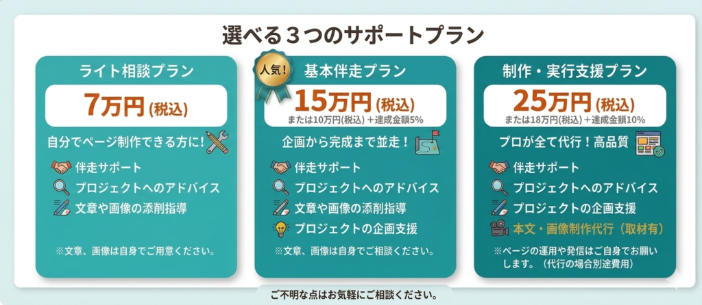 文章や画像をつくるのがニガテな方には添削や代行を行うプランもあるので安心です。オプションとして撮影や画像・動画・チラシ制作などもお受けできます。