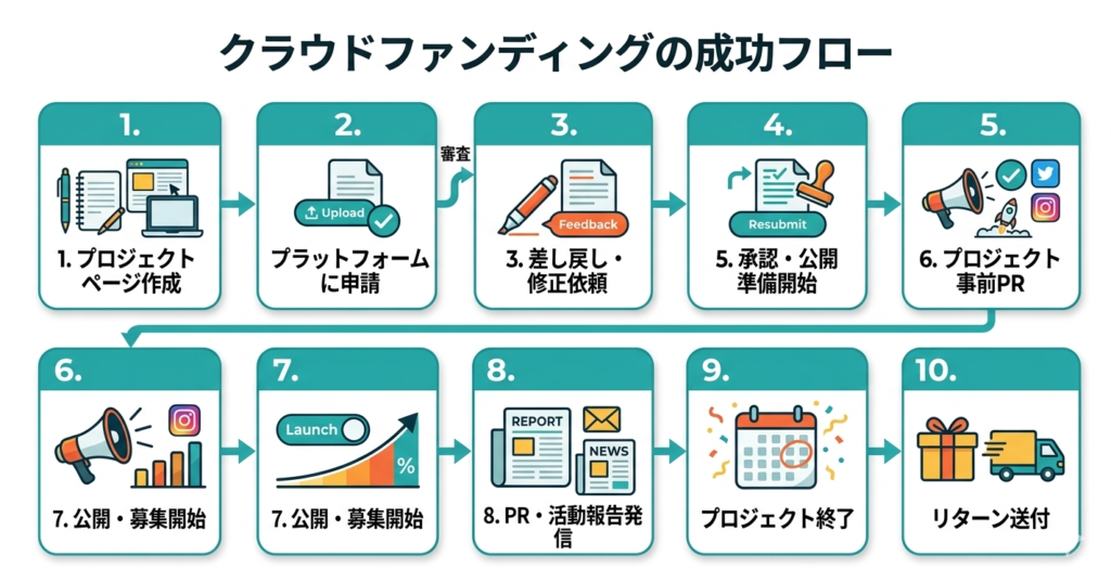 プラットフォーム選び、企画の見せ方、ページ構成、リターン設計、公開後の発信。